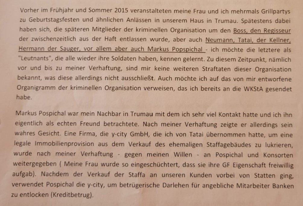 Einen prominenten Platz nehmen in der Anzeige Thurn’s ehemaliger Geschäftspartner Markus Pospichal sowie der angebliche Sauger (Kredithai) Hermann Mahr a/k/a „Hermann der Sauger“ ein. Sie wären Leutnants einer kriminellen Organisation rund um David Neumann gewesen, so führt Thurn aus. Er verweist dabei auf die politischen Kontakte von Pospichal. So wäre dieser mit dem Grafen Alfons Mensdorff-Pouilly sehr gut gewesen.