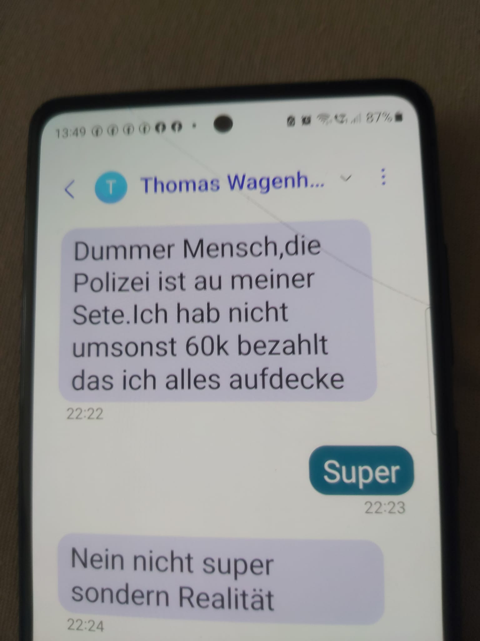 Aber nachdem er behauptet, dass er die Polizei mit €60.000 bestochen hätte, kommt er vielleicht damit durch (Kommunikation liegt uns vor, siehe Screenshot links).