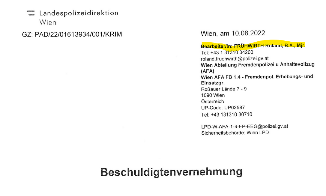 Tatsache ist, dass die Vernehmung des Beschuldigten im August 2022 in der Polizeikaserne in der Roßauer Länder durchgeführt wurde. Das Verfahren gegen den Beschuldigten wurde in der Folge eingestellt. Major Frühwirth ist mit der Szene der Wiener Wilden bestens vernetzt. Das wird wohl auch seine von ihm herbeigeführte Zuständigkeit in dieser Sache erklären.
