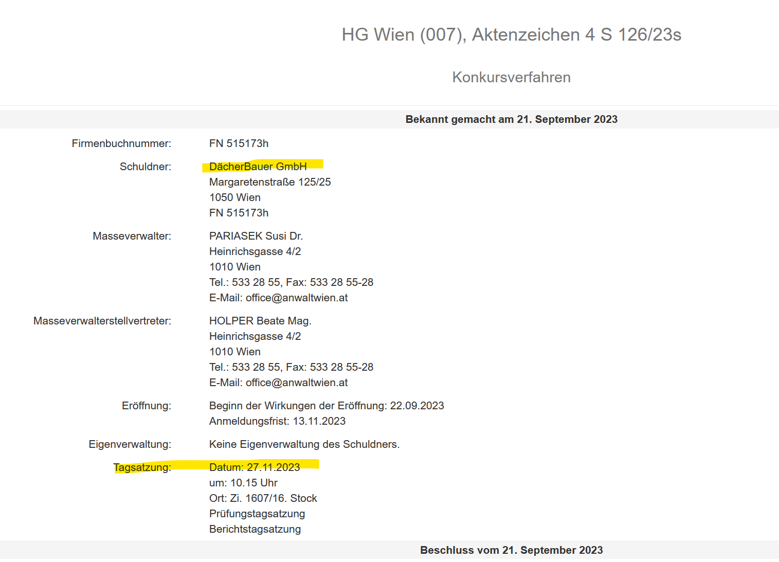 Vielen Dank wieder einmal an dieser Stelle an unsere Whistleblower, die uns mitgeteilt haben, dass bei der DächerBauer GmbH des Käfigkämpfers Betton Karabulut unter dem Aktenzeichen 4 S 126/23s das Konkursverfahren am 21. September 2023 bekannt gemacht wurde. Zur Masseverwalterin wurde Dr. Susi Pariasek bestellt. Die erste Tagsatzung findet am 27. November 2023 um 10.15 statt.