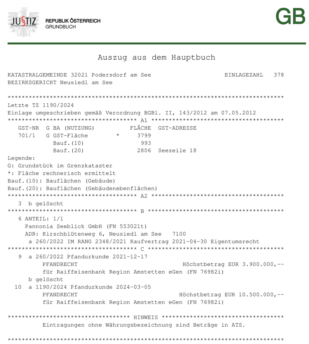 Kürzlich wurde in der KG 32021 EZ 378 mit Urkunde vom 20.02.2024 ein Pfandrecht in Höhe von € 10.500.000,- eingetragen. Zuvor bestand bereits ein Pfandrecht über € 3.900.000,- per 17.12.2021.