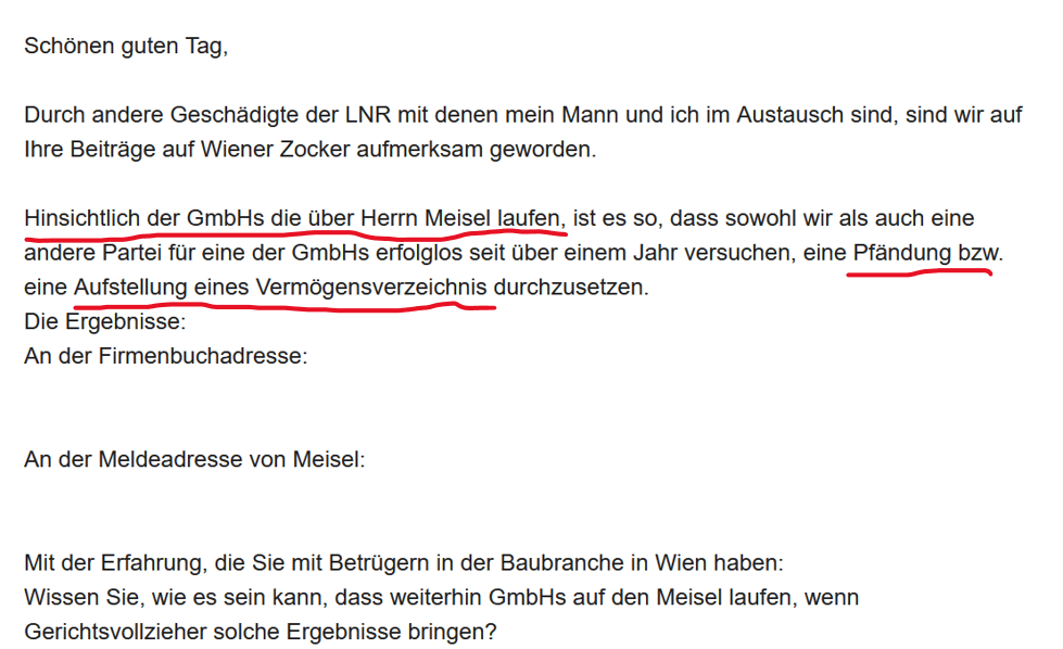 Zunächst möchten wir uns bedanken für den Input und die Hinweise die wir von unseren Lesern (Sie entschuldigen bitte, dass wir auf Wiener Zocker auf das Gendern verzichten) erhalten. In der letzten Zeit erhalten wir vermehrt Beschwerden über die Geschäftspraktiken des Wiener Zockers Lukas Neugebauer und seines Entsorgers Friedrich Meisel. Es melden sich Kunden seiner Immobilienprojekte die verzweifelt versuchen zu ihren Rechten zu kommen. Wir empfehlen Ihnen: machen Sie Strafanzeigen. Warum erklären wir Ihnen.