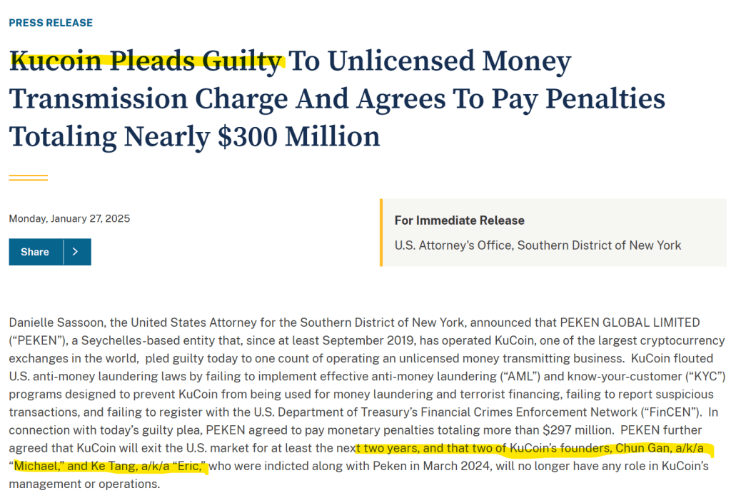 Dass ausgerechnet KuCoin sich Wien als MiCA-Heimat ausgesucht hat, ist pikant. In den USA hat sich die Börse Anfang 2025 schuldig bekannt, ein nicht lizenziertes Geldtransfer-Geschäft betrieben zu haben, und zahlt dafür knapp 297 Millionen Dollar an Strafen und Einziehungen. Außerdem muss KuCoin den US-Markt für mindestens zwei Jahre verlassen (Quelle: US DOJ). Das war alles erst im Jänner 2025, die FMA wird das sicher wissen. Stauber ohnehin.