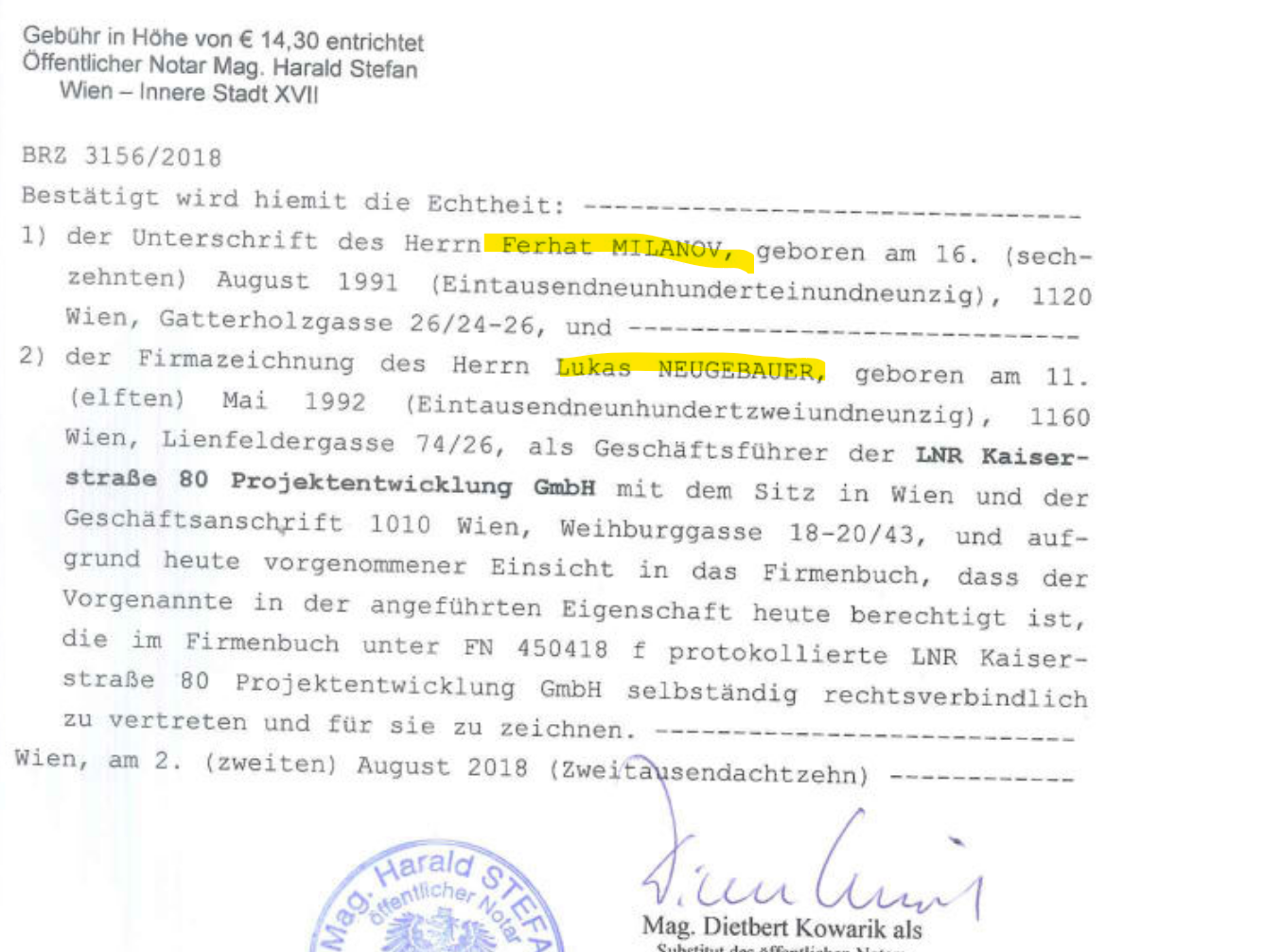 - 2018: Erwerb Top 45 von einer LNR-Projektgesellschaft um € 1,05 Mio. Zu diesem Zeitpunkt war Milanov bereits als Manager und Geschäftsführer in der LNR-Gruppe aktiv (beispielsweise als GF bei der LMF Erzherzog-Karl-Straße 31 Immobilien GmbH).